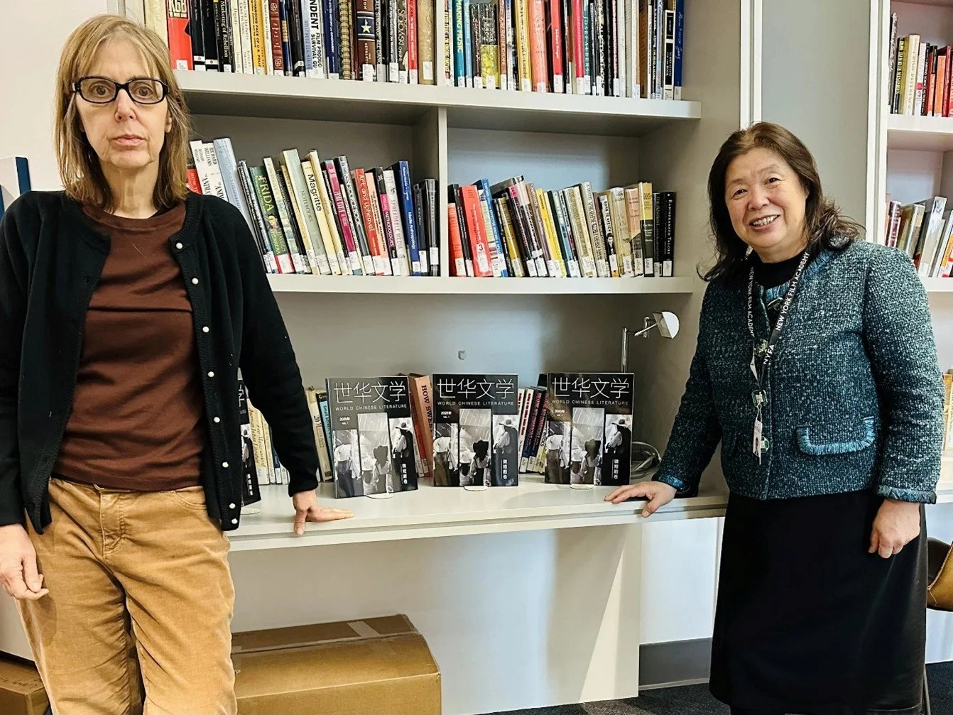 (Photo, from right: Dr. Joy Zhu, Executive Vice President of the New York Film Academy, and Ms. Marti Reppetto, Head Librarian, pose with World Chinese Literature.)