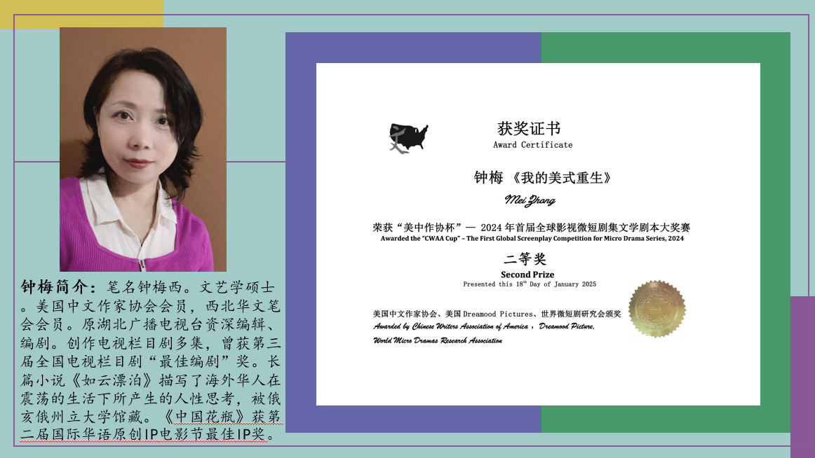 二等奖钟梅:感谢大赛评委会和组委会颁给我这个奖项,感到非常荣幸。这个荣誉不仅属于我个人,更属于我们美国中文作家协会。最后,也祝贺其他获奖者,希望大家在微短剧这个赛道获得更大的成绩和荣誉,也希望“美中作协杯”微短剧大赛越办越好!