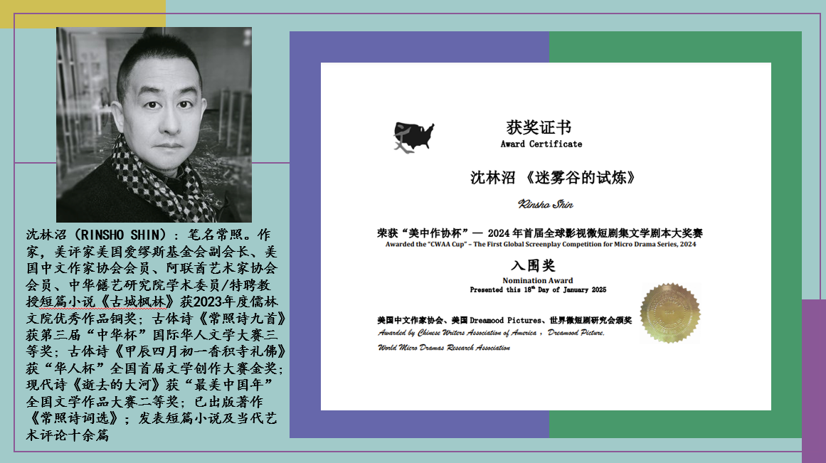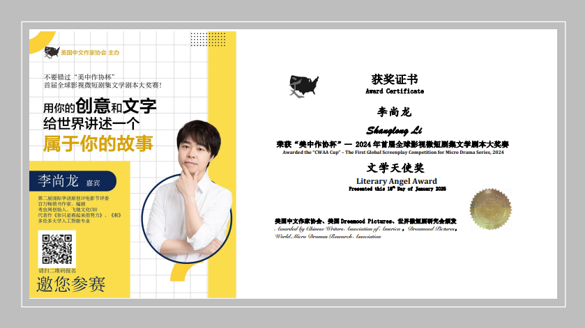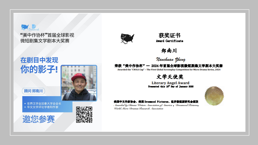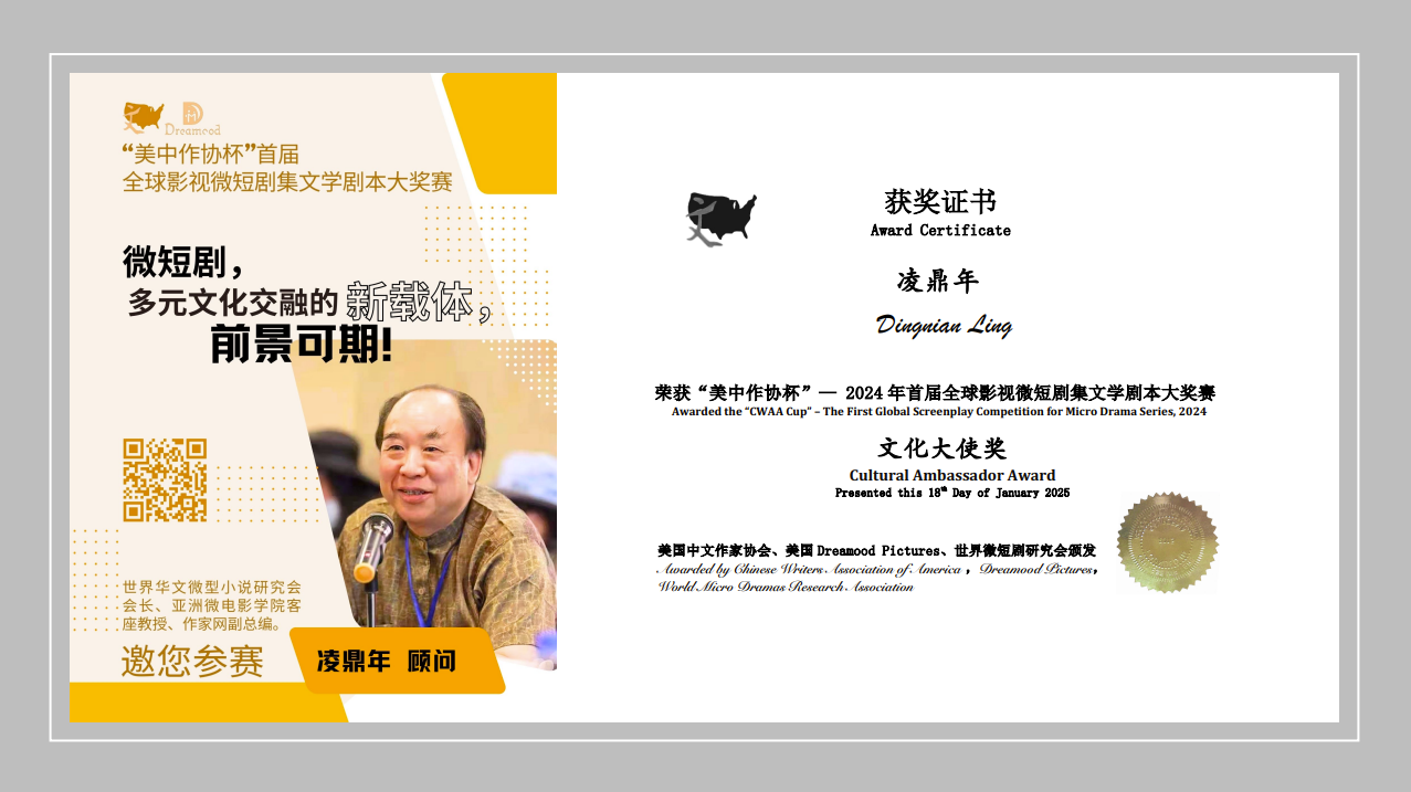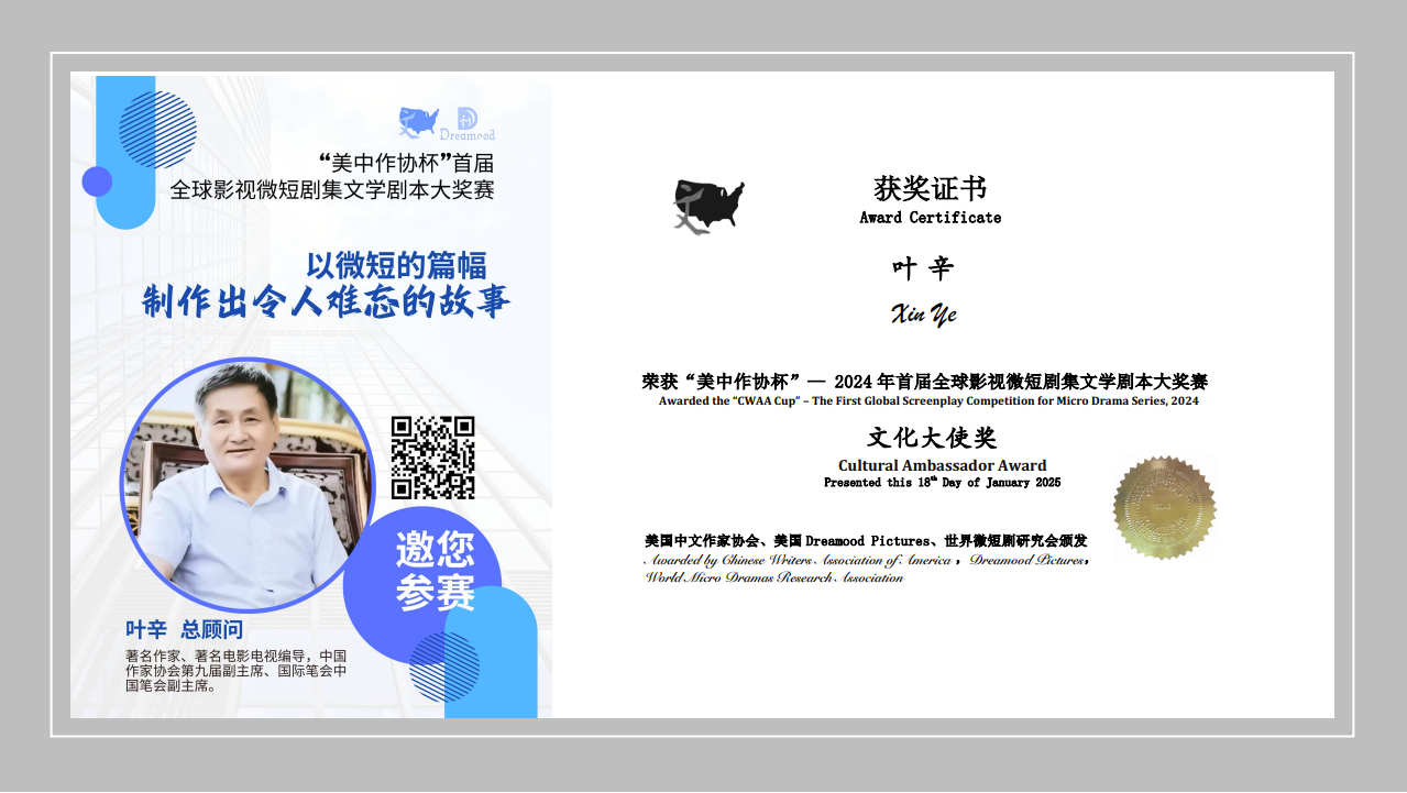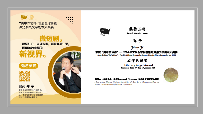 2025年1月18日,“美中作协杯-首届全球影视微短剧文学剧本大奖赛”颁奖典礼在互联网上隆重举行。这场盛会,汇聚了全球文学、影视和文化领域的杰出人物,用文字的力量点亮岁月的星空,为微短剧文学的发展开启了新的篇章。