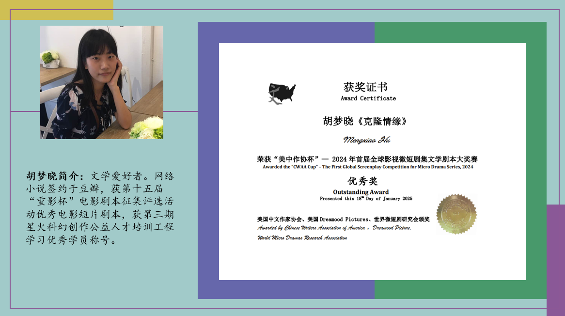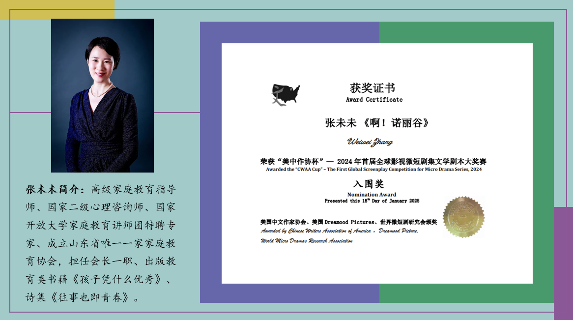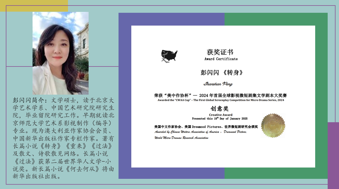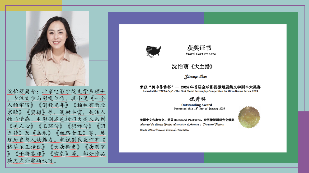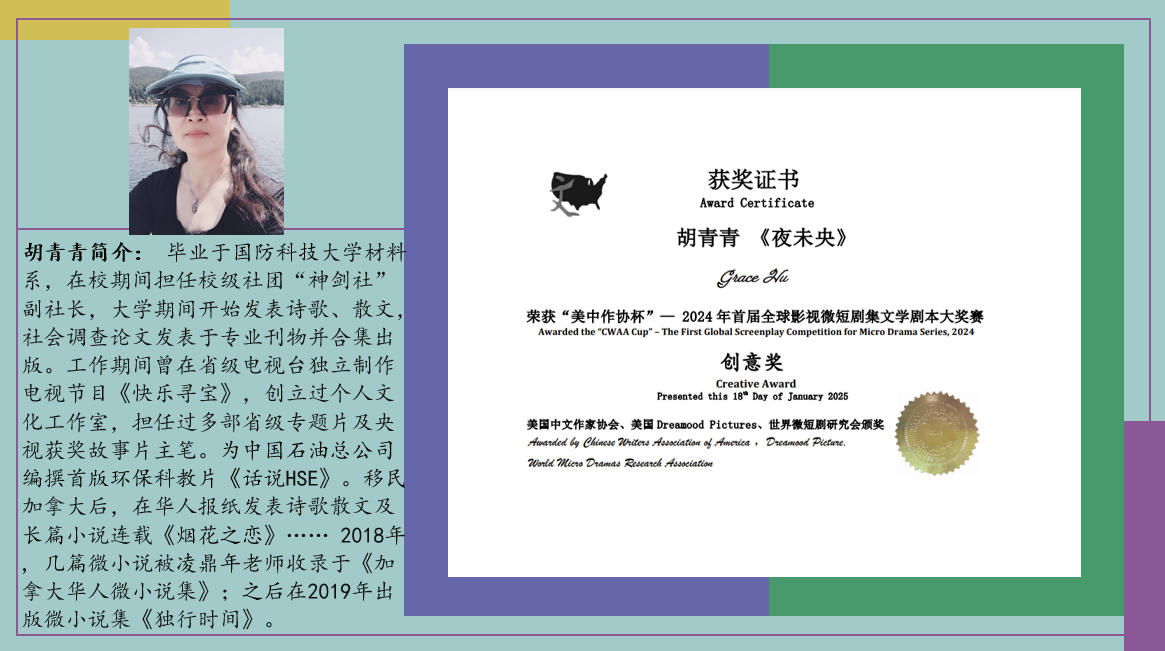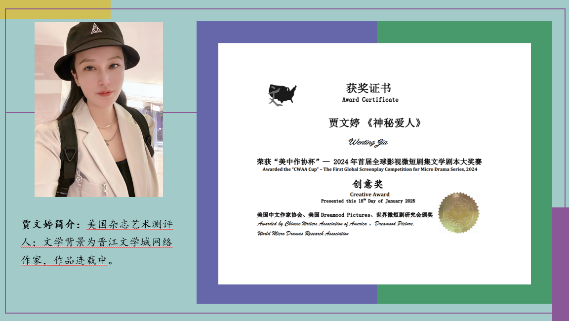 创意奖贾文婷:由心感谢美中作协给予的机会。有缘得以专业为纸,文学为笔,故事为线,创意点亮色彩,共同打造迎接全新的视听盛宴,绘出短剧绝美画卷。
