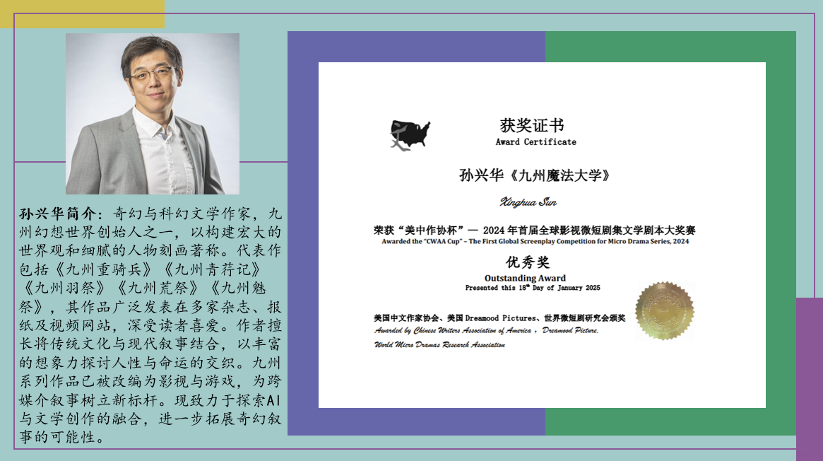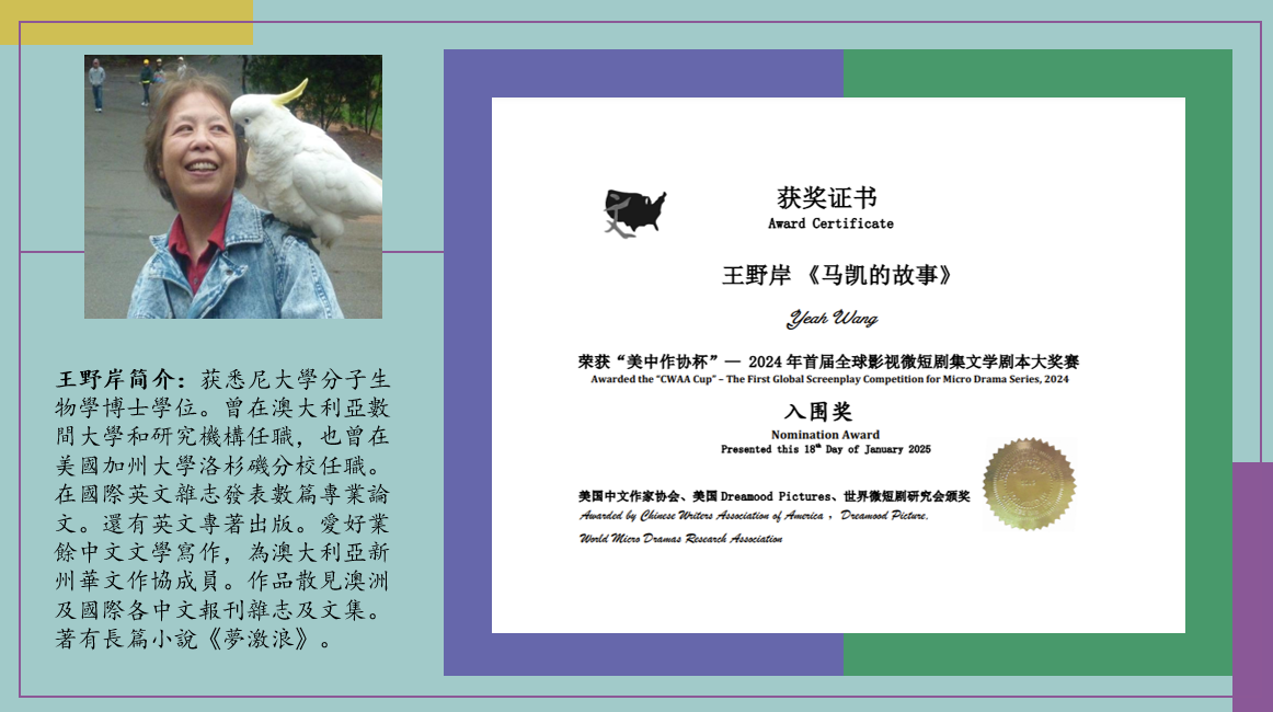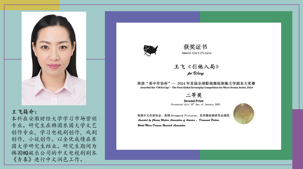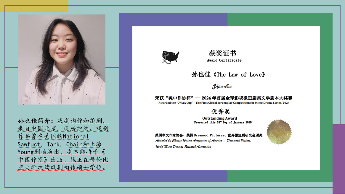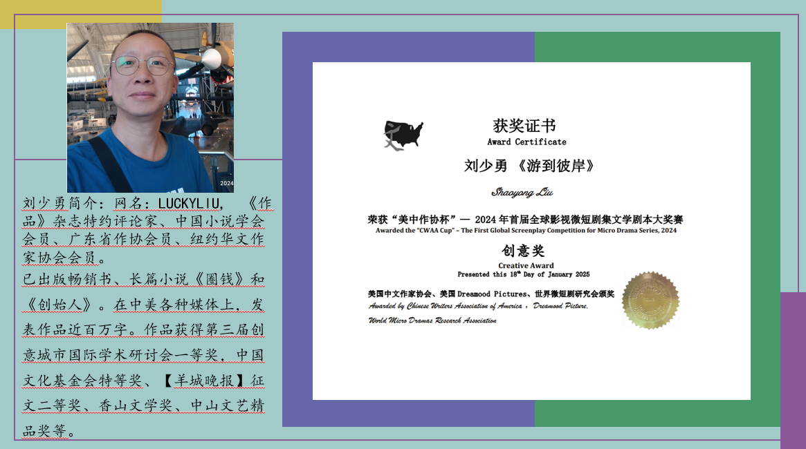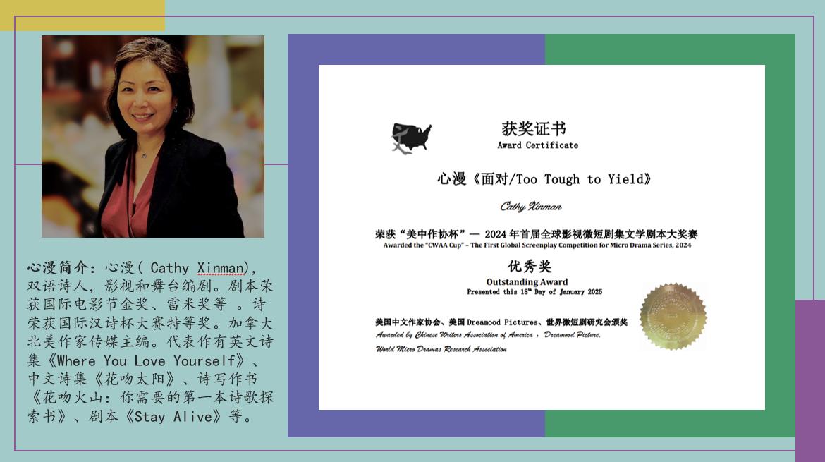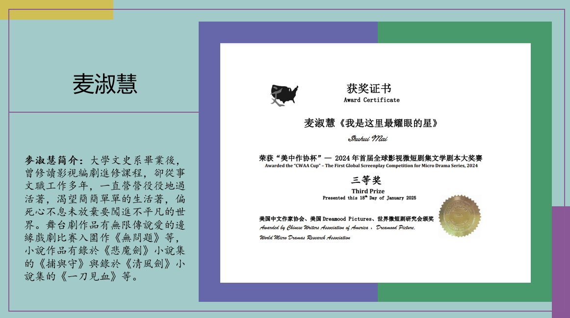 创意奖贾文婷:由心感谢美中作协给予的机会。有缘得以专业为纸,文学为笔,故事为线,创意点亮色彩,共同打造迎接全新的视听盛宴,绘出短剧绝美画卷。