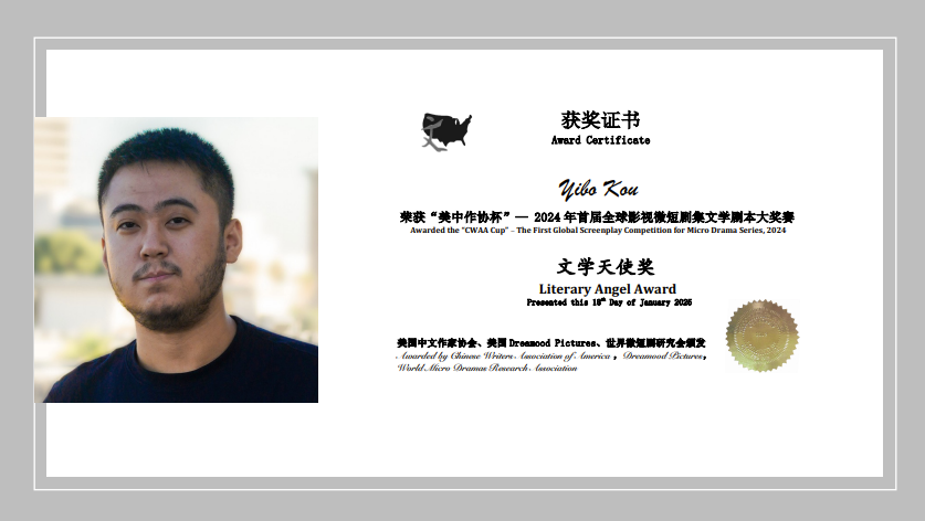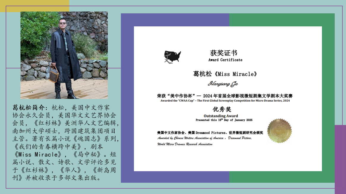 优秀奖葛杭松:非常荣幸能够获奖。感谢评委会的青睐。感谢美国中文作家协会和Dreamood Pictures影视公司的组织。这不仅是对我作品的肯定,也是对我继续进行英文剧本创作的鼓励。希望获奖者们的作品能够早日落地拍摄并和观众见面。