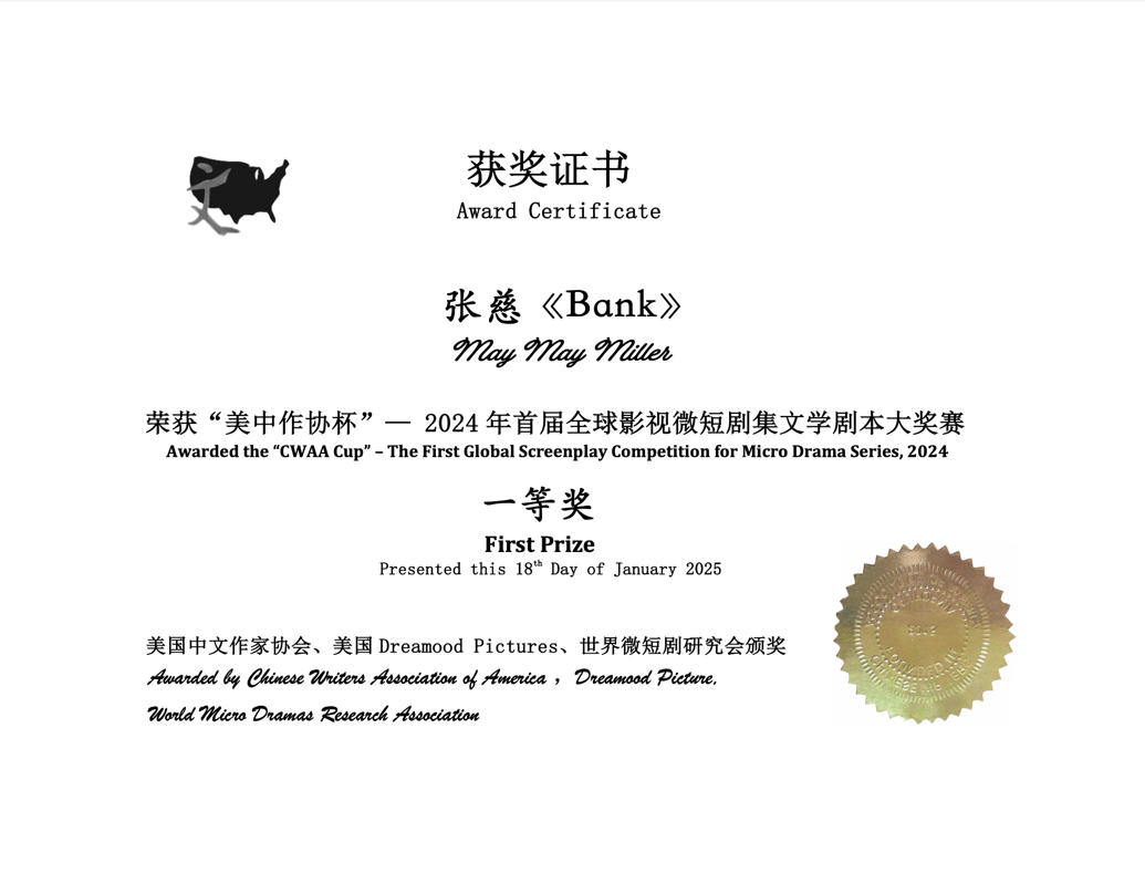 本届大赛评委会执行执行主任、美中作协秘书长崔萍,作为大会主持人请出法律顾问王志明律师,宣读了公证声明,确认了评奖的评选程序公平、公开、公正,所有获奖名单与排名真实有效。 一等奖由大赛终审评委、组委会主席李岘博士授予荣誉证书、组委会财务长谭瑞钦先生为获奖者颁发了一千美元的奖金。获奖者张慈女士1983年加入中国协会,现为好莱坞她的获奖作品60集微短剧《Bank》,以独特的主题、简洁的叙述,提出了微短自助的艺术形式,有望拍摄落地。