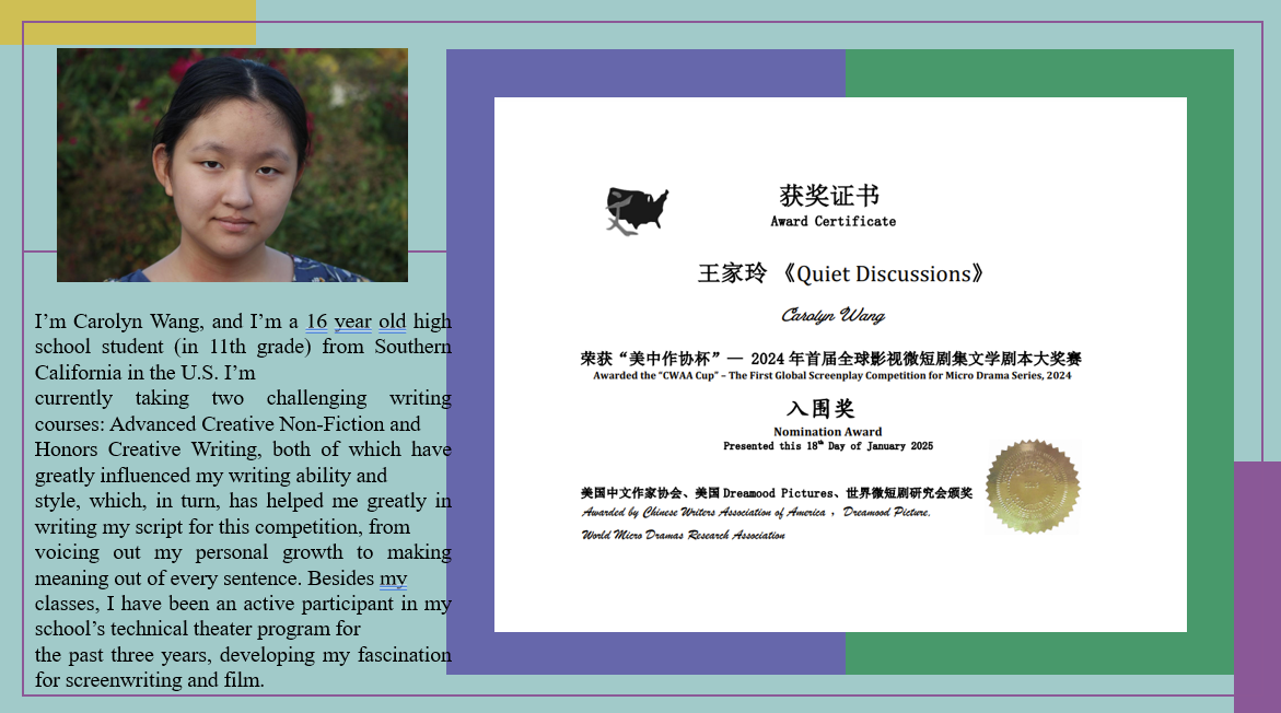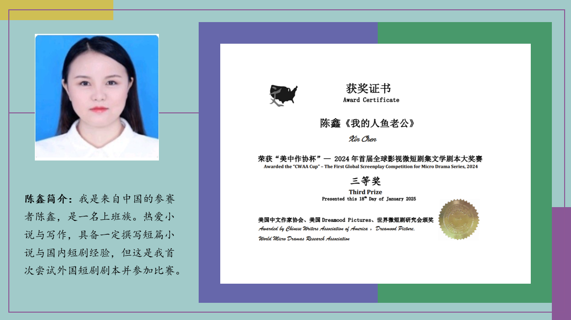 三等奖陈鑫:荣获此奖, 我感到十分意外跟惊喜,我深知,比起那些更有经验、更优秀的获奖者, 我仍需不断学习和进步。同时,我十分感谢大赛给予我这个机会,也希望“美中作协杯”微短剧大赛越办越好,希望大家在未来能取得更多成绩。