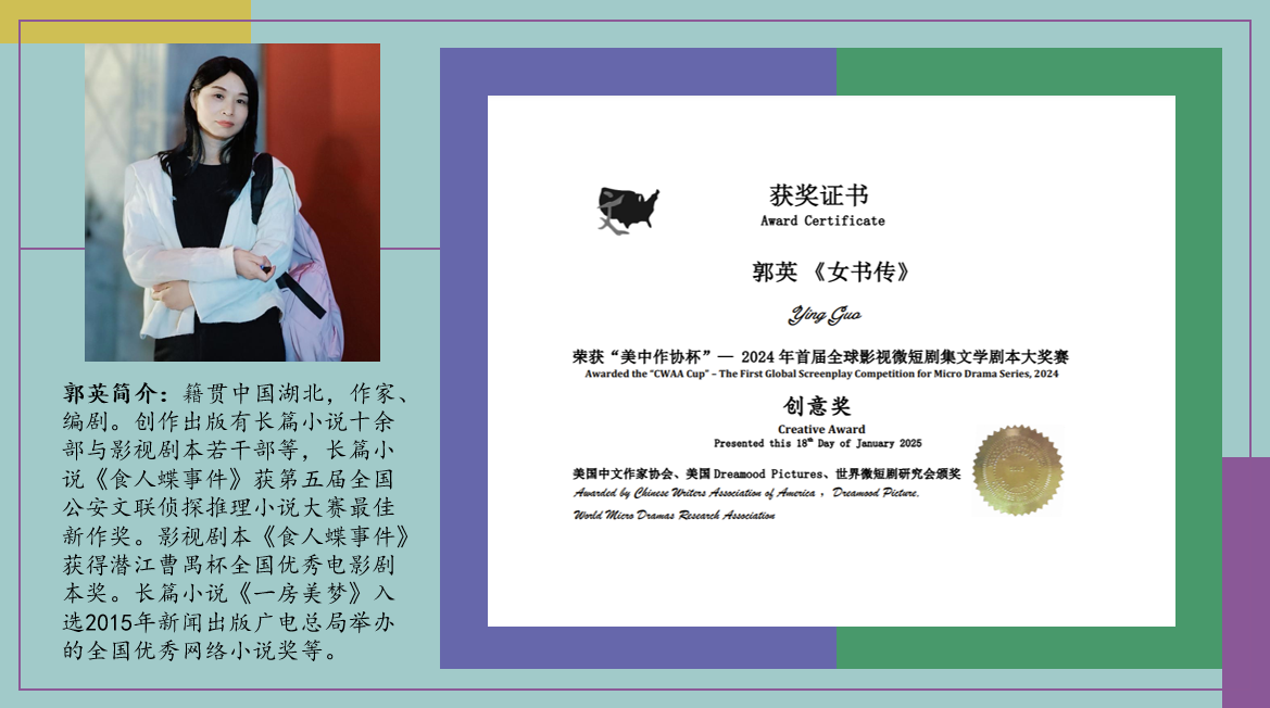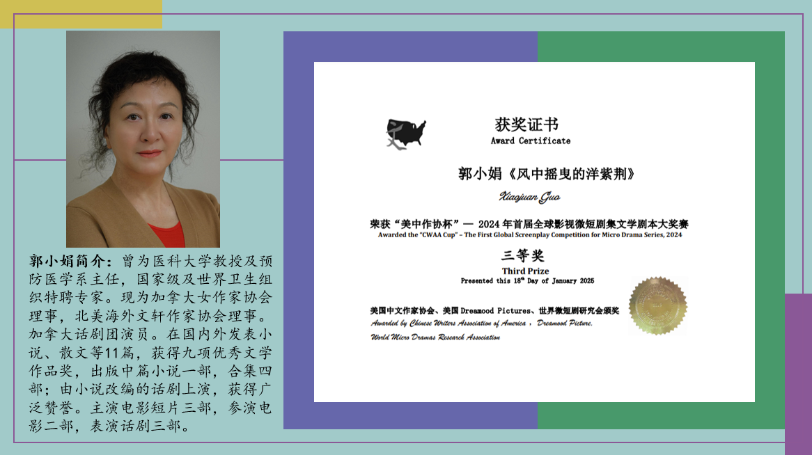 三等奖郭小娟:非常荣幸能获得首届全球中美作协杯大赛的三等奖。昨天参会才知道,大赛名家云集,对于我这个第一次写悬疑短剧剧本的人,获奖非常震惊和惊喜,这是2025年最好的新年礼物。评委会和组委会的严谨认真态度和辛勤工作也很受感动。祝贺其他获奖者,祝大赛越办越好,祝各位新年快乐!
