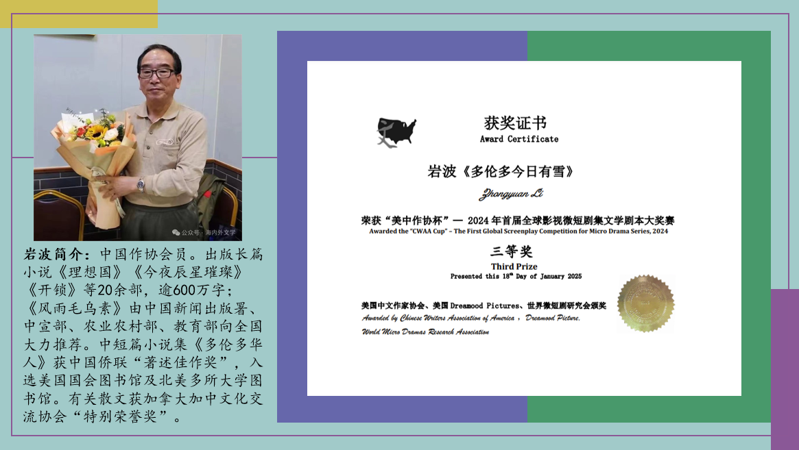 加拿大魁北克华人作家协会董岩会长:李岘主席与工作人员辛苦了!热烈祝贺“美中作协杯-全球影视微短剧集文学剧本大奖赛”颁奖典礼圆满成功!
