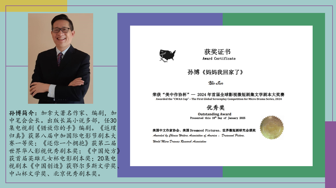 优秀奖孙博: 众所周知,最近几年微短剧爆火。遗憾的是,作为一个传统的影视编剧,没有看过一部微短剧,打心眼里还有点儿瞧不起它。但是去年6月8日,作为这次大赛支持单位之一的代表,参加了美中作协主办的影视论坛,被伊诺女士的讲解吸引了,2个小时的干货使我收获满满,一夜之间改变了对微短剧的看法,觉得它节奏快、反转多、很好玩。讲座后的几天,我边消化笔记边刷屏,看了几部微短剧,有的制作精良,吸引人付费追看。那时,我已完全被微短剧征服了,也悄悄点燃起创作的欲望。经过一周的思考,决定借这次大赛的东风试水。就这样,我将微短剧处女作《妈妈,我回家了》献给了大奖赛,承蒙诸位评委的厚爱,有幸获得了优秀奖,谢谢你们的鼓励!可以说,没有这次大赛,我不可能碰微短剧,再次感谢李岘主席及组委会成员的辛勤付出!