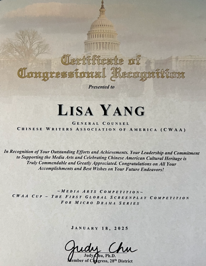 与此同时,美国国会议员赵美心(Judy Chu)也通过视频送上祝贺:“感谢美国中文作家协会(CWAA)及主席李岘博士(Dr. Gee-Schweiger)组织了这一盛会,将讲述者们汇聚一堂,共同庆祝文字与创意的力量。还要感谢总顾问杨华莎(Lisa Yang)的邀请,以及她对社区的贡献。CWAA自2015年成立以来,为作家搭建了一个蓬勃发展的平台,通过讲故事,促进文化交流与社区连接。今天的比赛彰显出CWAA对创新微短剧形式的推动。这种形式以简练而有力的方式激发创意、呈现多样化主题,促进全球文化的多元与包容。我要祝贺CWAA整个团队成功举办如此有意义的活动。你们的努力不仅丰富了我们的社区,也为更加紧密联系的故事,为未来的创作铺平了道路。感谢你们,并祝贺这一重要时刻的到来!”