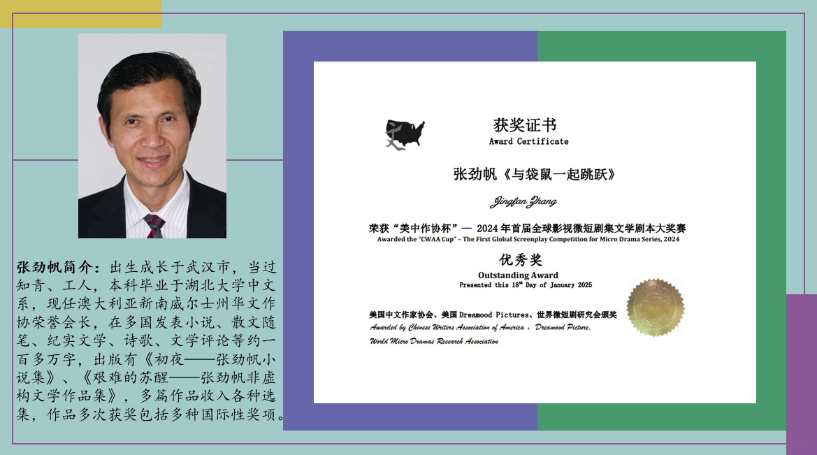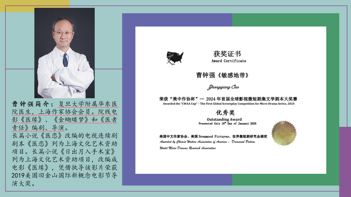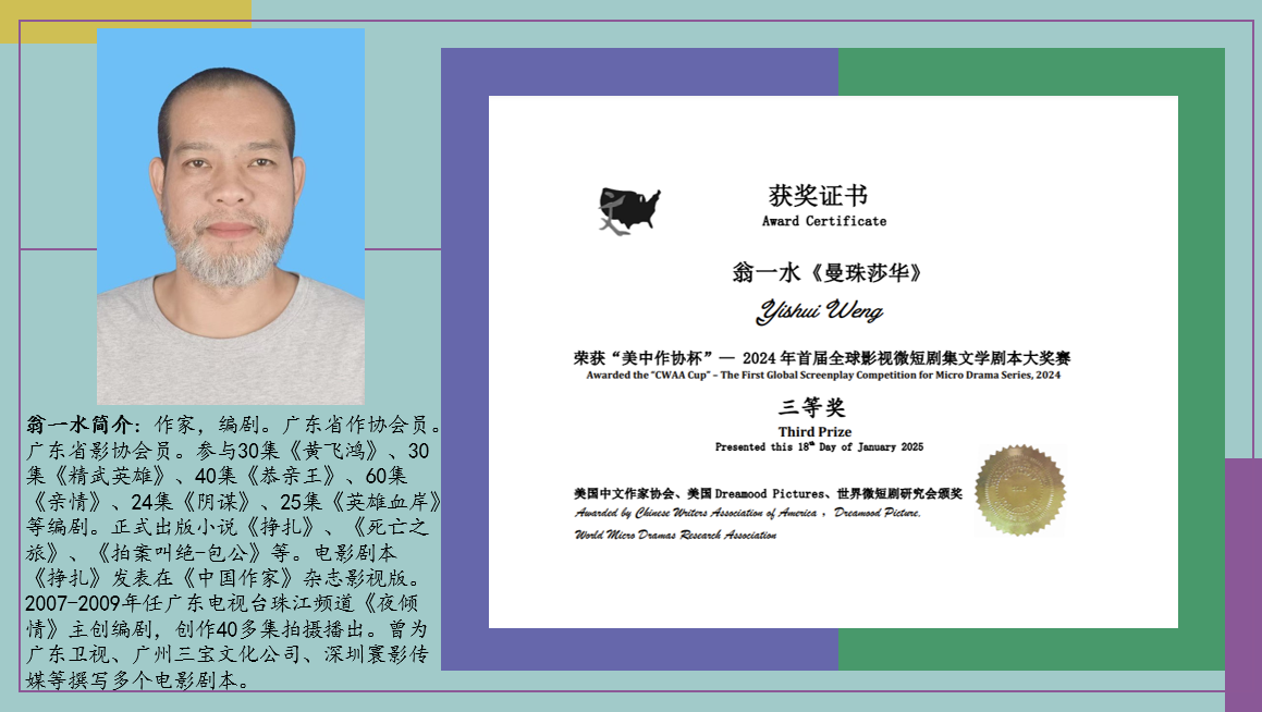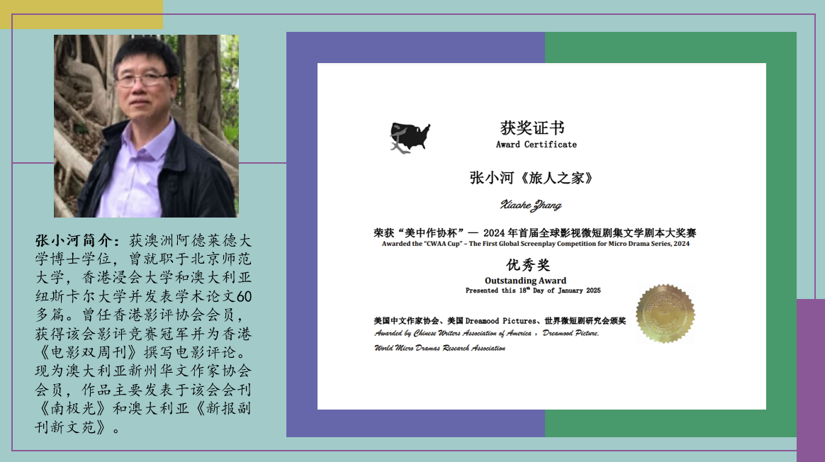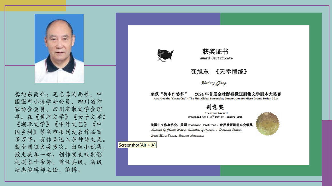 美国洛杉矶华文作家协会黄宗之荣誉会长:热烈祝贺美中作协影视大奖圆满成功,热烈祝贺首届全球影视微短剧文学剧本大奖赛所有的获奖者!热烈祝贺我们美国洛杉矶华文作家协会理事张慈荣获一等奖!感谢美中作协,举办今天的文学影视盛会!