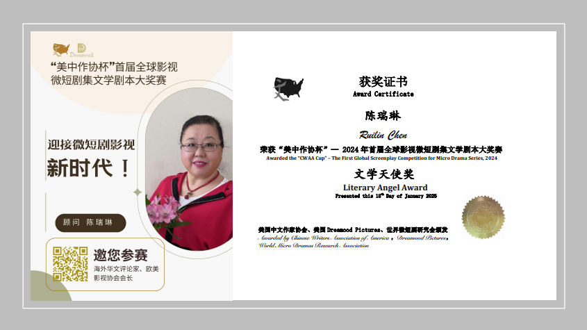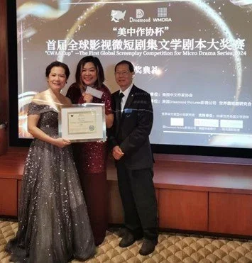 顾问陈瑞琳:首先要热烈祝贺“美中作协杯”首届全球影视微短剧文学剧本大奖赛所有的获奖者!感谢美国中文作家作会举办今天的文学影视盛会,围绕着梦想,高度,未来这六个主题大字,旧雨新知从世界各地汇聚一堂,推动海外华人文学对接影视产业的桥梁。好的文学如果跟影视结合在一起,就会产生巨大的能量,所以我们呼吁海内外作家为华人影视文学提供更好的文学作品,完成时代赋予海外作家的文学使命,发挥文学传播的巨大作用。再次热烈祝贺首届全球影视微短剧文学剧本大奖赛圆满落幕!