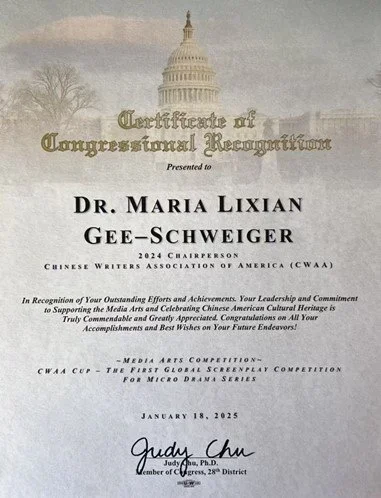 她在嘉奖中写到:李岘博士(Dr. Maria Lixian Gee-Schweiger)、美国中文作家协会 (CWAA)主席,为表彰您在媒体艺术支持及庆祝华裔美国人文化遗产方面卓越的努力与成就。您的领导力与奉献精神令人高度赞扬,深受感谢。恭贺您取得的所有成就,并祝愿您未来的事业更加辉煌!